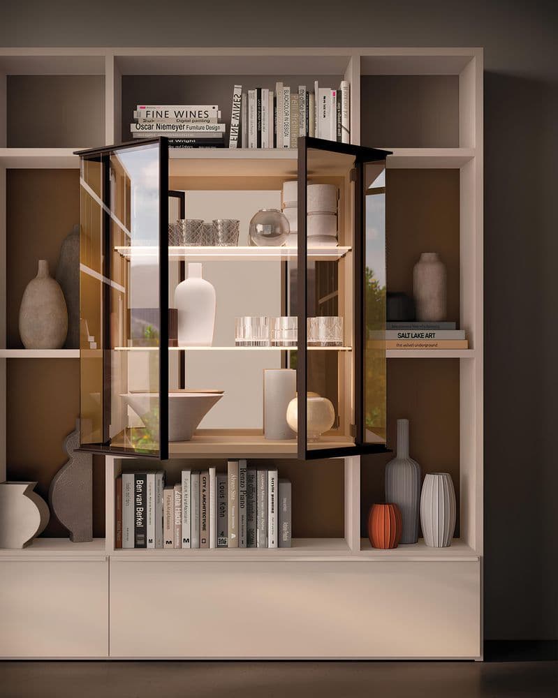 Alba 34 è una parete soggiorno con libreria modulare, pensata per chi ama l’ordine e la funzionalità. Il sistema a spalla permette di organizzare vani di diverse dimensioni, garantendo uno spazio ideale per libri e oggetti, con un’estetica raffinata e contemporanea.