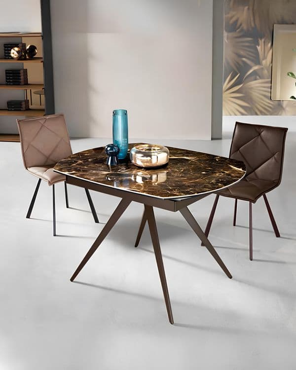 Il Tavolo HALL unisce robustezza ed eleganza. La struttura in metallo verniciato e il piano in grès porcellanato effetto marmo lo rendono un elemento d’arredo sofisticato e funzionale.