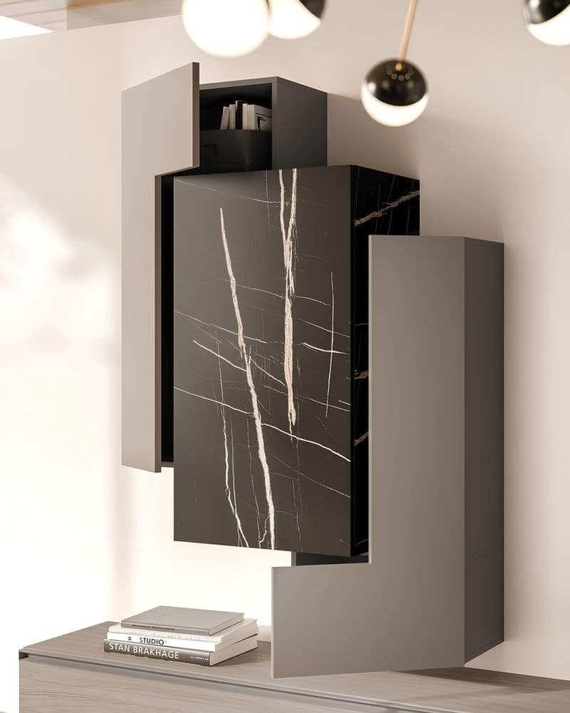 Scopri i materiali e le finiture che definiscono la bellezza e la funzionalità della parete soggiorno Rock.