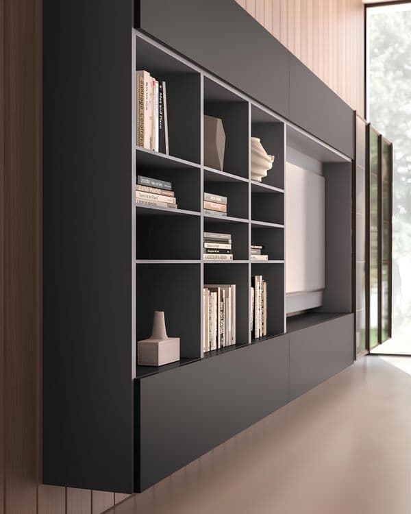 - Tipologia: Parete attrezzata sospesa con librerie, contenitori e vano TV